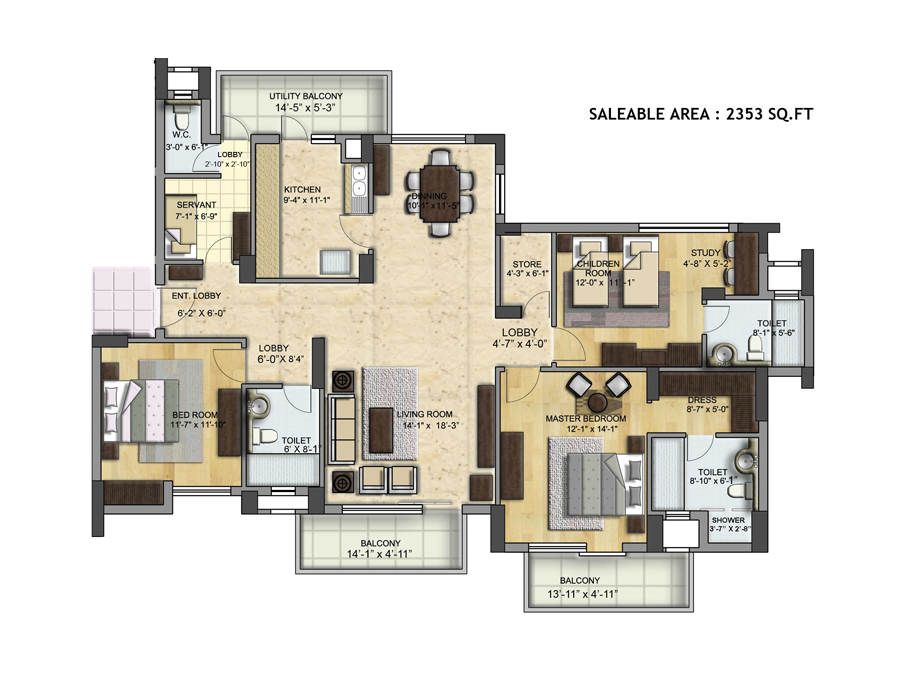 3 BHK + 1 Study + 1 Servant + 4T =2353 SqFt