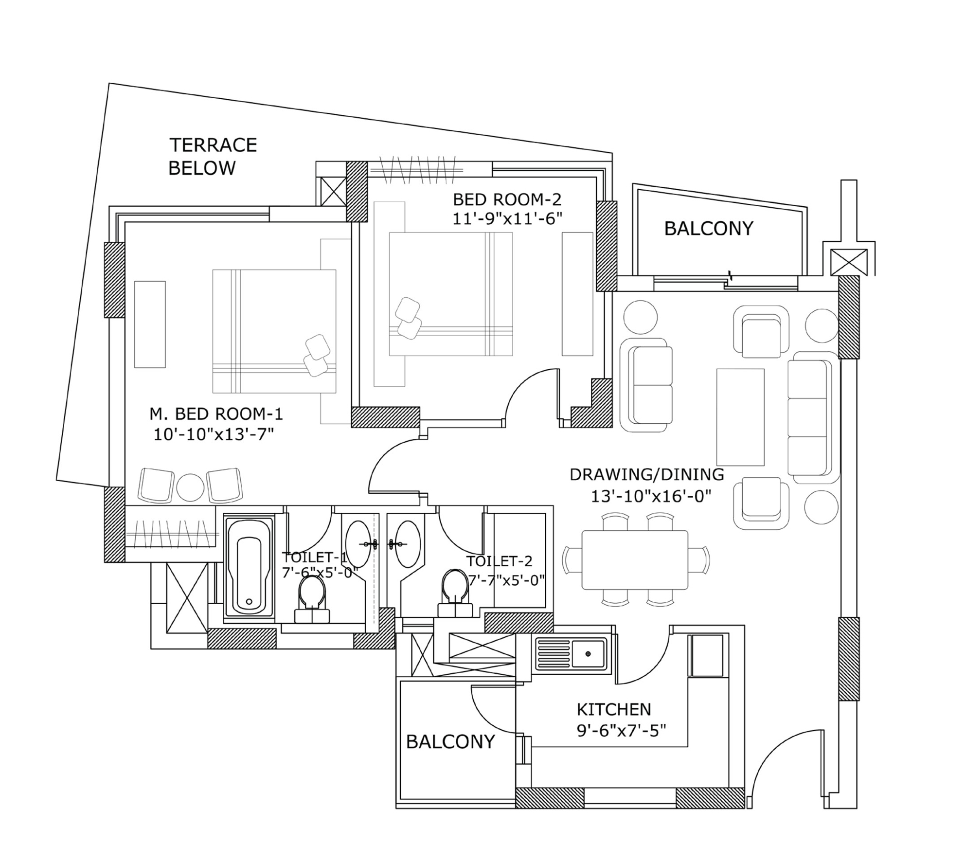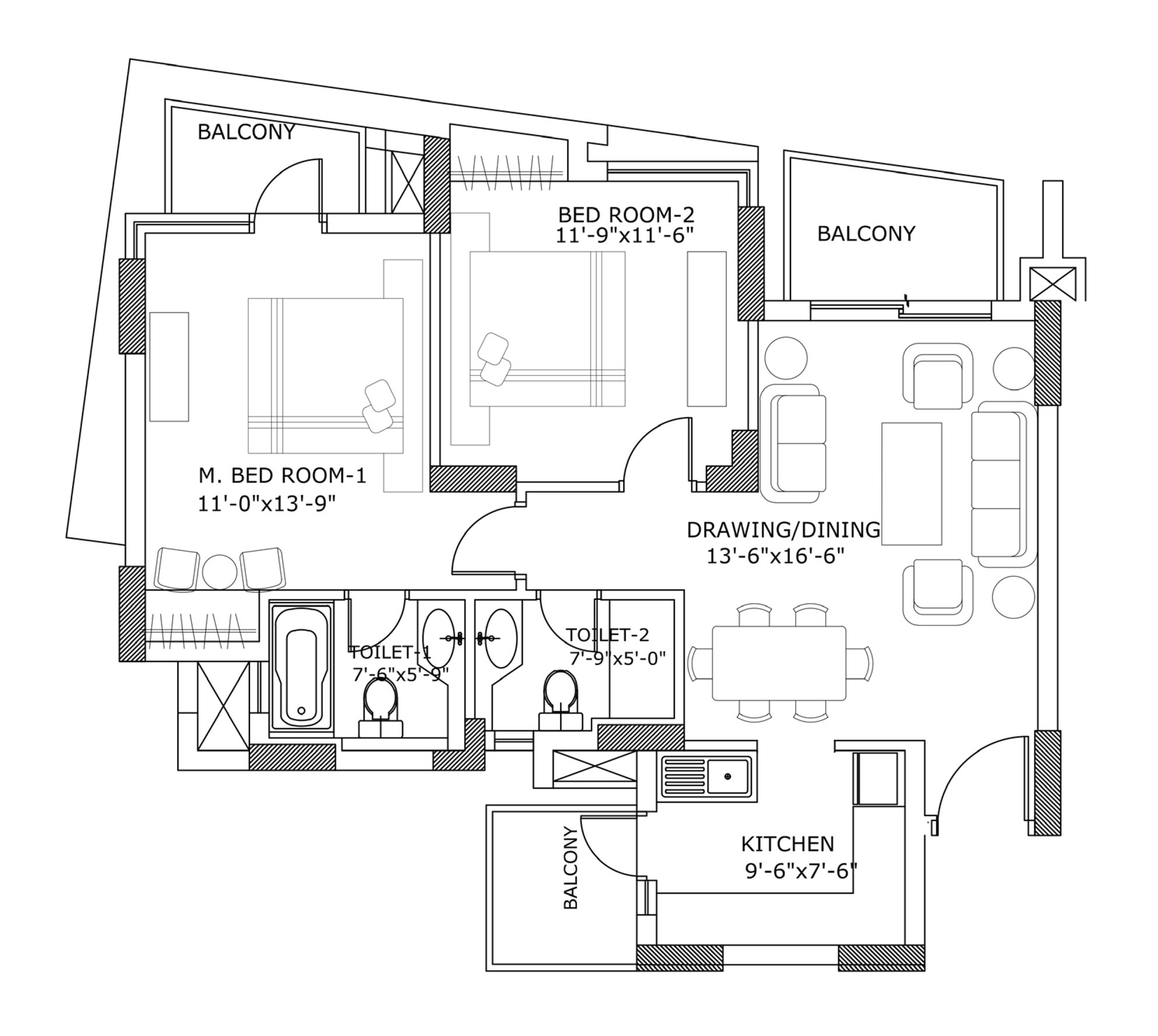 2 BHK + 1 Servant + 2T =1448 SqFt