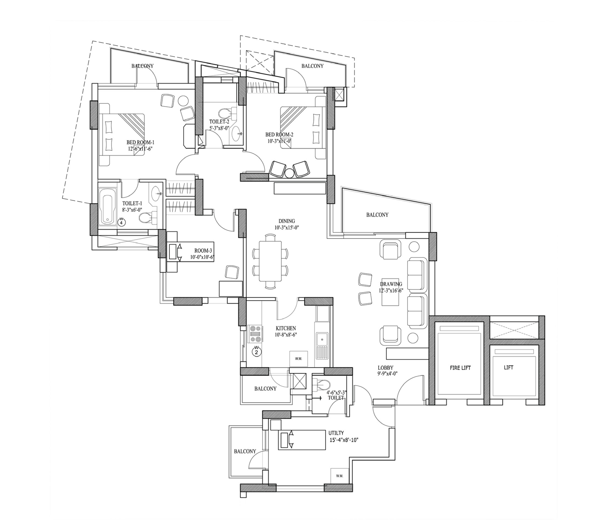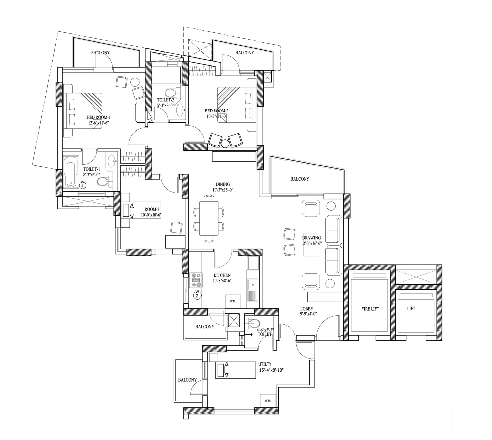 3 BHK + 1 Servant + 3T =2194 SqFt