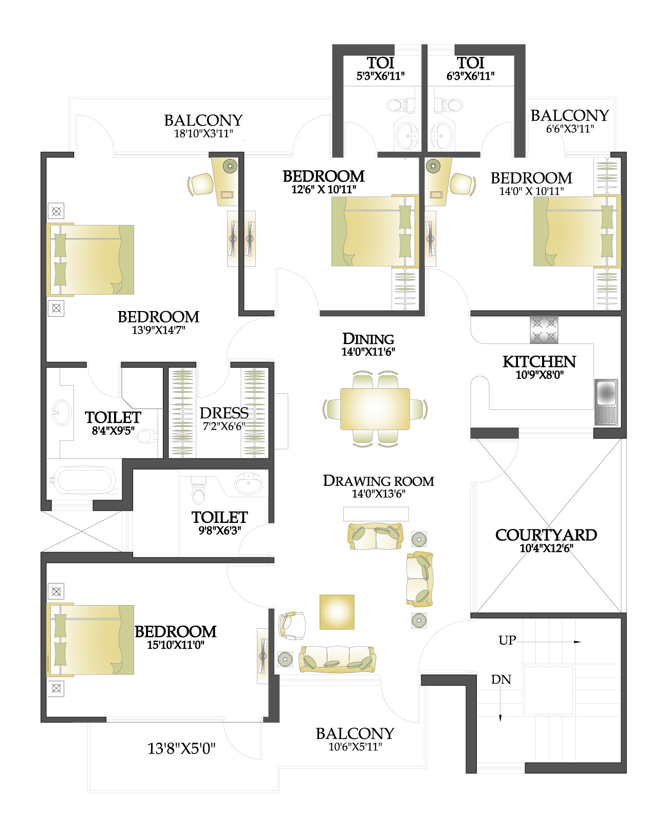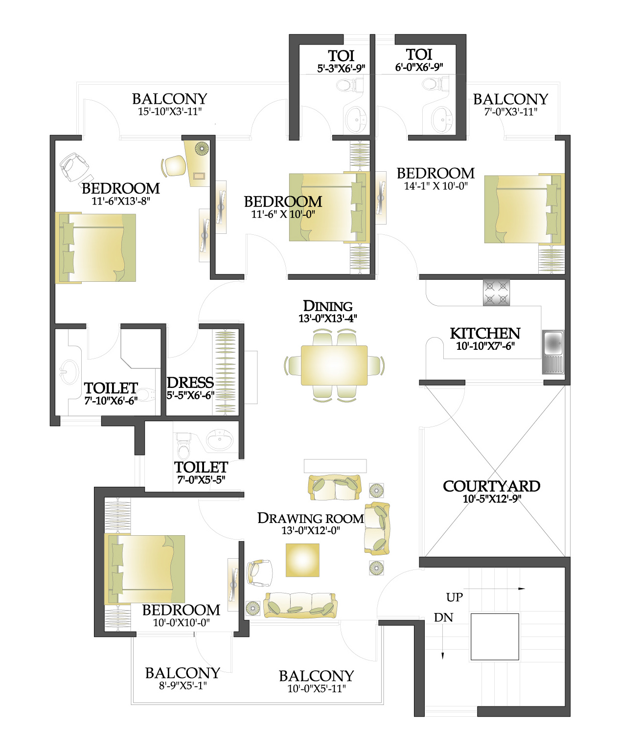 Each unit of three floors stands on its exclusive grounds complete with front and real lawns. Truly beautiful in look and feel, the floors at RPS Palms offer 3 and 4 bedrooms with toilets, sprawling living room, store/dress room and attached balconies, along with the host of modern amenities. The view of the landscaped grounds is breathtaking. Feast your eyes on lush lawns, neat concrete roads and flowering blooms…or celebrate life on the jogging tracks, swimming pool and gym in the clubs of RPS City.